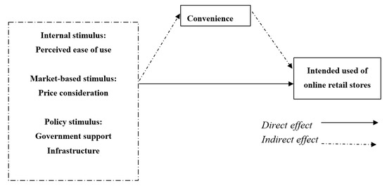 This study, in particular, focuses on exploring the fundamental drivers of use intentions of online retail stores. Because this is an exploratory study and since we do not want to limit ourselves to extant technology adoption models such as TAM and UTAUT, it is important, therefore, to draw on a model that allows us to gain initial insights into the research issue. Hence, we consider the use of stimuli-organism-response (SOR) model [15,16,17] as adequately appropriate in this work. This paper, therefore, contents that in Ghana, where due to inadequate information and communications infrastructure there is low Internet penetration, the construct government support infrastructure will play a key role in intentions to use online retail stores by enhancing perceived convenience (see also [14,18]). We, therefore, hold the view that government support infrastructure is a fundamental macro-environmental stimulus for consumers’ behavioural intentions towards online shopping through the mechanism of the perceived value of convenience. Moreover, since common wisdom and classic economic theories suggest that market-based stimuli such as price/economic considerations influence consumers’ decisions in multiple and significant ways [19]; this paper, therefore, test the proposition that economic considerations, particularly concerning pricing, positively stimulate adopt decisions concerning online stores use intentions by enhancing perceived convenience. Finally, because it has long been articulated that ease of use is an influential factor in adoption decisions [8,20,21,22,23,24], this study further tests the proposition that ease of use will influence intended use of online retail stores by enhancing perceived convenience.