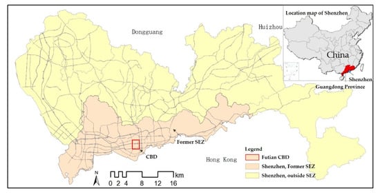 Shenzhen is a pioneer city adjacent to Hong Kong on China’s southeast coast and is considered to be the first and most successful Special Economic Zone (SEZ) in Mainland China (Figure 1). The Futian CBD is located at the center of the belt-like city, five kilometers west of the Luohu original urban center of the SEZ. It is highly accessible from the rest of the city. Highway, expressway, high speed train, airport express railway, and four additional subways cross the Futian CBD. The adjacent Futian port and Huanggang port gave Futian quick and convenient communication links with Hong Kong, the source of much of the foreign direct investment [27]. Hundreds of modernist skyscrapers are gathered here, with some relatively low-level commercial and service facilities, as well as public spaces, interspersed.