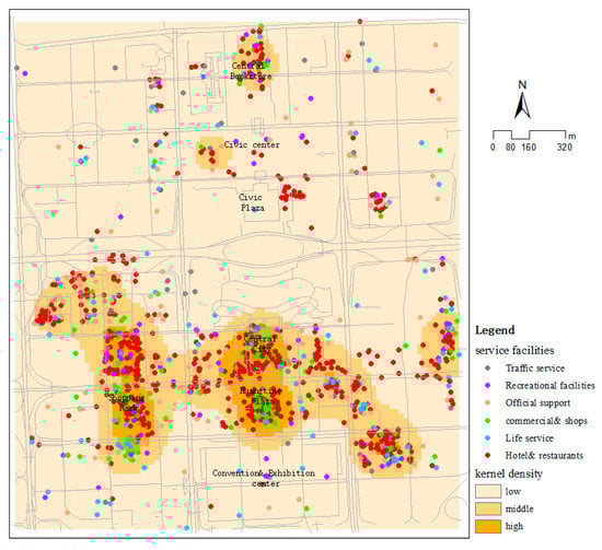 The distribution of facilities is generally uneven in the Futian CBD (Figure 3). Although the plan designated a large number of cultural and commercial plots for development, the existing facilities are concentrated within the southern part of Futian. The huge number of service facilities and use intensity reflects the high service concentration of the southern part of the Futian CBD. In the northern part, however, the facility density is much lower and unevenly distributed, with only a few scattered facilities and without a shopping center or mall (Figure 2). On plots developed for business use, there are almost no service facilities. The Central Bookstore, where dozens of shops and restaurants are collected, provides a limited number and types of commercial services; however, it does so far away from the official buildings. In a word, the provision of service facilities is agglomerated and uneven, especially in the northern part (Figure 3). This outcome reflects a lack of attention to the development of such facilities by the government, even if the urban plan allowed them in the first place.
