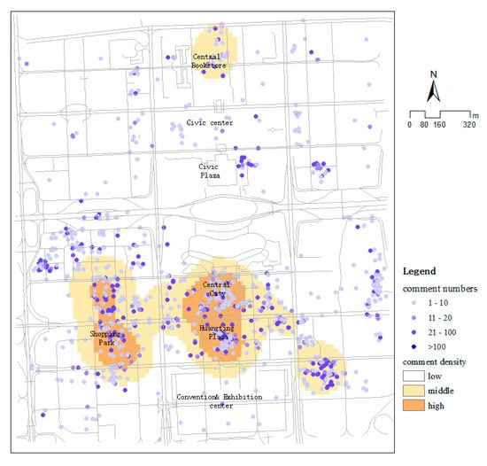 Here we see two different distribution models of service facility in the Futian CBD: concentrated commercial business facilities and dispersed support facilities. To investigate how these service facilities are used and the intensity of use, we employ the number of user comments from social media to compare vitality between different types of facilities.