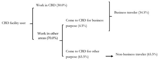 Initially intended for the convenience of business travelers working in the CBD, the service facilities are shown to attract a lot of non-business travelers based on the results of our questionnaire. According to the purpose for visiting the CBD and their workplace, the facility users are divided into two categories: business travelers and non-business travelers (Figure 5 and Figure 6). Business travelers, comprising those who work in the CBD or come for a business purpose, account for 34.5% of the respondents. Non-business travelers refer to other respondents.