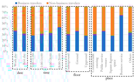 Different users are not evenly distributed in time or space. In a day, the proportion of business travelers among CBD facility users grows gradually from morning to afternoon and reaches its peak in the evening (Table 6). Non-business travelers are more likely to visit the CBD on rest days (OR = 1.354) and the daytime (OR = 1.368). This is a clear piece of evidence that the CBD’s service facilities have greatly boosted the vitality on rest days. Business travelers are more likely to use ground floor facilities (OR = 1.368). This result indicates that the underground and aboveground transit systems needs improvement, especially convenient walking connections. In terms of travel mode, business travelers are more likely to choose a bicycle (OR = 1.575) or walk (OR = 1.868), while non-business travelers are more likely to use public transportation, such as a bus (1.396) or the subway (OR = 1.722). The mass transport system contributes greatly to attracting non-business travelers.