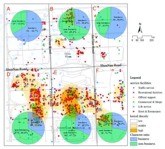 Spatially, CBD facility users mainly congregate in the southern part of CBD, where most of the service facilities are provided. Taking Shennan avenue and the main roads as separating lines to divide the CBD into six sections (Figure 7), there are very few service facilities in the northern part of the CBD. Specifically, in section A and section C, the density of service facilities is the lowest (Figure 3), resulting in the lowest user density (Figure 7). The proportion of non-business travelers in sections A and C is much lower than it is in other sections. The land use map (Figure 2) shows that in sections A and C there are mainly residential and business plots, with a few commercial plots. This unbalanced spatial distribution of land use leads to the unbalanced distribution of facility users and activity vitality.