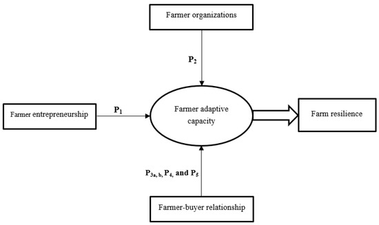 We emphasize the role of the farmers since climate change adaptation behavior was shown to be the result of the cognitive process of the farmer [31,32], which also includes entrepreneurship [33]. Therefore, to understand farmer adaptive capacity as the potential to convert and reconvert existing resources into effective adaptation strategies, there is a need to incorporate the farmer psychological factors, particularly entrepreneurship, in the assessment. In addition, value chain collaboration, both horizontal with other farmers (through farmer organizations) and vertical with the buyers of produce (through farmer–buyer relationships), also contributes to improving farmer adaptive capacity. We conjecture that (a) farmer entrepreneurship, (b) membership in farmer organizations (FOs), and (c) the nature of farmer–buyer relationships play powerful roles in shaping farm resilience through their influence on the farmer adaptive capacity.