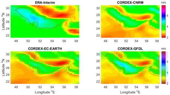 To evaluate wind power potential and its future variability under climate change impacts, it is common to employ near surface wind speed from available GCMs or RCMs. For that purpose, this study uses three regional climate models obtained from CORDEX simulations which have higher resolution than GCMs. Moreover, they were downscaled using different dynamical and statistical techniques. Therefore, there is no extra effort for data regionalization. As the study area is located in the Middle East, CORDEX outputs for domain of Middle East and North Africa (MENA) were taken into consideration. For this domain, only three RCMs including CNRM, EC-EARTH, and GFDL (all with spatial resolution of 0.44 × 0.44°) were available in daily time scale and subsequently all of these three RCMs were used. CNRM has been developed by Centre National de Recherches Meteorologiques in France, EC-EARTH is a European community Earth-System Model, and GFDL is referred to as the Geophysical Fluid Dynamics Laboratory which is one of the seven research laboratories of National Oceanic and Atmospheric Administration (NOAA). The data were obtained for the historical period of 1981–2000 and future period of 2081–2100. The selected historical period is the common period for all the three RCMs. Moreover, the climate change studies usually consider future variations after 100 years from the historical one. Dealing with future datasets, they are available for different scenarios indicating different representative concentration pathways of RCP2.6, RCP4.5, RCP6, and RCP8.5. Generally, RCPs are greenhouse gas concentration trajectories that have been presented and substituted with the former socioeconomic scenarios in the fifth assessment report. These concentration pathways represent a possible range of radiative forcing values for the year 2100 in Watt per square meter. RCP2.6 and RCP8.5 were considered as the optimistic and pessimistic scenarios, respectively. RCP4.5 and RCP6 are intermediate scenarios in which RCP4.5 and RCP8.5 are more common scenarios than the others for climate change studies. Thus, in this study, RCP4.5 was chosen as an intermediate and common scenario used to project future variation of wind power. Concerning to climatic data, it is a common task to evaluate their consistency with a reference data that has formerly been successfully applied for the study area. In this regard, ERA-Interim reanalysis data obtained from ECMWF (European Center for Medium Weather Forecasts) was used to check consistency and accuracy of the RCMs during the historical period. Figure 2 illustrates mean annual wind speeds over the study area for ERA-Interim and three RCMs during 1981–2000.