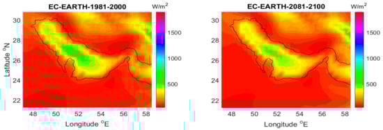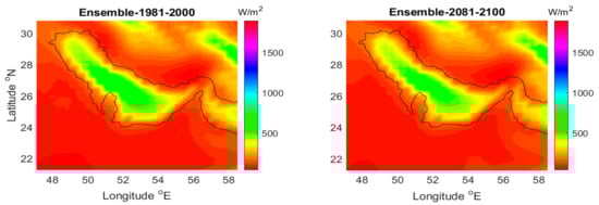 where air density can change according to the regional conditions. According to a detailed study on the air density in the Persian Gulf, it was found that the density is changing in a range of 1.15–1.23 kg/m3 [27]. In this study, an average value about 1.18 kg/m3 was considered as air density over the whole study area. It is noticed that this study is mainly organized to investigate climate change impacts on wind power and, therefore, if some assumptions were made for computations, they are for both historical and future periods in which the errors of them can be neutralized or neglected. Equal weights were assigned for each RCM to build the ensemble model. Moreover, dealing with climate change studies, it is most common to assign equal weights to the selected GCMs/RCMs as the future performance of the models are not known [21].