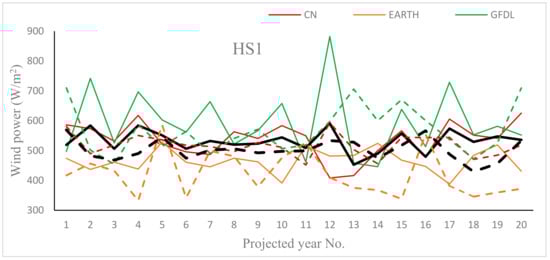 Interannual variability of wind power can illustrate wind power variation in a yearly time scale. More interestingly, in climate change impact studies, it can reveal the future yearly variation pattern versus historical period to get more insights of the temporal power distribution. In this regard, interannual projection of wind power for the three selected hotspots was carried out to analyze their variability and pattern over projection years. The results for the historical period (solid line) and for the future RCP4.5 scenario (dashed line) obtained from the ensemble model and also from the three RCMs are presented in Figure 7, Figure 8 and Figure 9. In these figures, the horizontal axis denotes projected year numbers from 1 to 20, that for historical and future periods include 1981–2000 and 2081–2100, respectively.