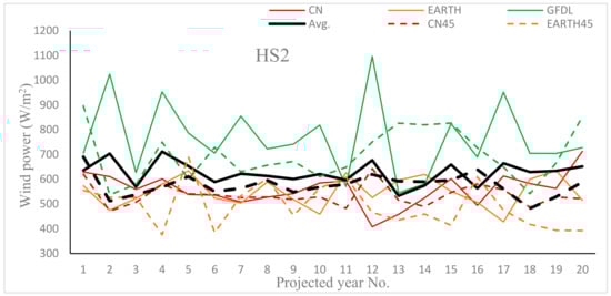 As presented in Figure 7, the ensemble model provides a roughly uniform pattern for historical and future periods indicating a mild decrease in wind power for hotspot 1. A similar result for each RCM can be derived but with slight fluctuations that can be neglected. Among the three RCMs, GFDL projects higher values and EC-EARTH provides lower values for wind power compared with the CNRM. However, from all the RCMs and also from the ensemble model, it can be inferred that the wind power density under future climatic conditions tends to slightly decrease compared to its corresponding values in the past. During 1981–2000, the wind power changes in a range of 500–600 W/m2 in which for 2081–2100 the upper limit remains the same while the lower limit falls lower than 450 W/m2. Regarding the RCMs, mean values obtained from CNRM showed less fluctuations while for the values for the two other RCMs increased and decreased with higher intensity. For the second decade, there are some sporadic years indicating higher values of wind power than its corresponding values in the past. However, it does not exceed the historical values remarkably. The interannual variability of the wind power is roughly less than 20% of the 20-year average of the power which can be promising toward its sustainability and suitability for the operational purposes.