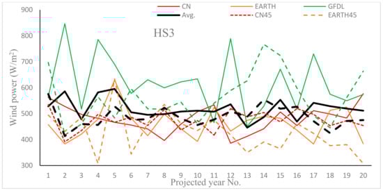 Regarding Figure 6, it is derived that the wind power for both periods do not differ remarkably which indicates climate change and future warming conditions do not affect the wind power distribution over the study area considerably. Similar spatial distribution and pattern for the spatial variability for both historical and future periods reveal that the regions with higher potential for energy extraction will remain the same. This is an interesting point dealing with sustainable development by which the current energy hotspots will remain as the future energy hotspots. Therefore, the present design and construction of the wind farm can be efficiently used for future energy supply purposes. Generally speaking, wind turbines are installed in some points with higher potential for energy extraction and more efforts are devoted to analyzing the results for tentative energy hotspots. In this regard, further explorations were concentrated on the selected hotspots to provide more details of the present and future variability of the wind power in the area. According to the previous illustrations which unanimously demonstrated that the middle part of the Gulf is the most powerful region over the Gulf, three points as tentative hotspots were selected for further investigations. These energy hotspots are marked as HS1, HS2, and HS3 in Figure 1. Mean annual wind power for historical and future periods obtained from the ensemble model along with their geographical coordinates are given in Table 2.