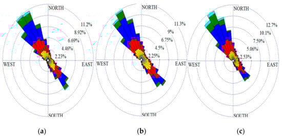 Considering Figure 12, similar conclusions for climate change impacts can be derived indicating that future simulations of wind power do not differ from the historical simulations in terms of the wind direction. However, it can be observed that the eastern winds are enhanced while the northwestern winds are slightly decreased. These results are valid for all the three RCMs considered in this study. A comparison among wind directions for three hotspots revealed that moving from northwest to southeast, impacts of eastern and southeastern winds will be enhanced while the effect of northwestern winds is attenuated. However, this change happens gradually along the Gulf. The main reason refers to the dominant wind regime which is more robust in northwest and middle parts of the Gulf and for other regions some other winds from different directions such as from eastern parts of the Gulf are highlighted.