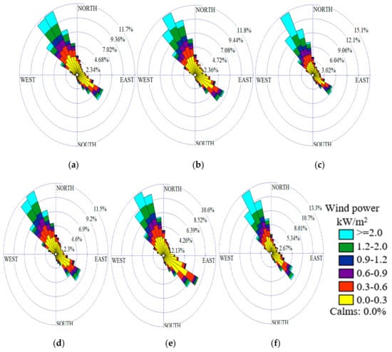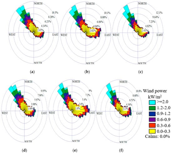 Wind power rose diagram for hotspot 2, historical simulations of (a) CN, (b) EARTH, (c) GFDL, and for future scenario of (d) CN45, (e) EARTH45, (f) GFDL45.