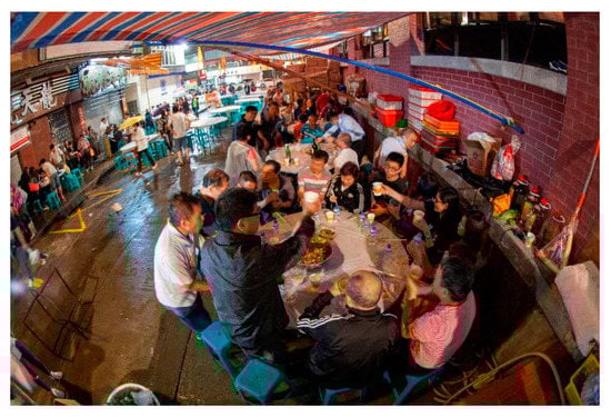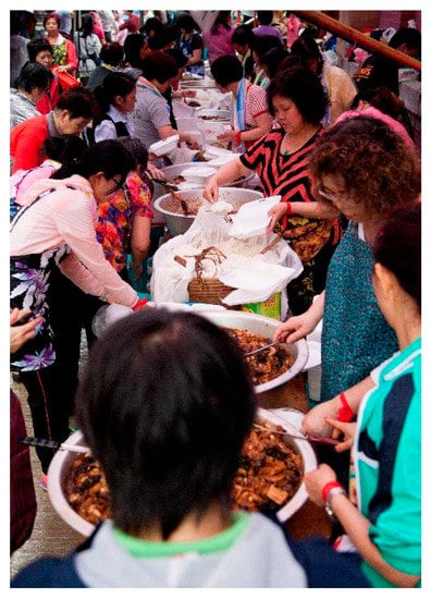 In an effort to increasingly promote the festival to a wider public and to accommodate the need for tourists, the location for the initial ceremony, as well as the route for the Drunken Dragon Dance, has been adjusted recently [26]. However, the festival reflects the typical pattern of what such a type of festival represents, as McKercher, Mei, and Tse [33] pointed out, in that it presents challenges in involving tourists for the local cultural experience because of the periodic and transient nature of the cultural festival as well as the spatial constraints of the festival venues. As the Drunken Dragon Festival is held only once a year for only two days, including the longevity rice feast on the evening of the day before the main festival day and the festival activities on Buddha’s Birthday, it is hard for tourists to adjust their visiting schedule solely to participate in this festival only. Furthermore, the festival programme does not currently cater to tourists because the main participants are residents, and the focus of the current form of the festival still is the resident participants. It is also not convenient for tourists with limited knowledge about the festival to be fully involved with it because of a lack of guidance and information available. Furthermore, despite the recent transformation of the festival venue to touristic places, the places where the festival has been held are local living spaces, mostly markets and a temple (i.e., Sam Kai Vui Kun Temple), which were not designed solely to host this festival.