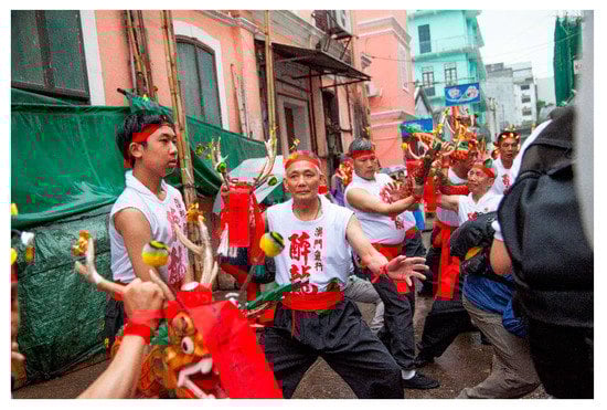 - Imon, S.S. Relationship between cultural spaces and continuity of a tradition: The case of Drunken Dragon Festival in Macao. In Proceedings of the Revisiting Kathmandu: Safeguarding Living Urban Heritage, Kathmandu, Nepal, 25–29 November 2013; pp. 237–242. [Google Scholar]