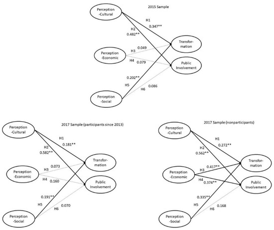 Differently from the festival participant samples, the perception about the economic impact of the festival for the festival non-participant samples from 2017 was significantly associated with the attitude towards transformation (β = 0.417, B = 0.390, p < 0.001). Thus, the null hypothesis of H3 was rejected. Similarly, the perception about the economic impact of the festival was not significantly associated with the attitude towards the involvement of diverse actors (2015 sample: β = 0.374, B = 0.336, p < 0.001), rejecting the null hypothesis of H4. The perception about the social exclusiveness of the festival was significantly associated with the attitude towards transformation of the festival (β = 0.335, B = 0.387, p = 0.092). Therefore, the null hypothesis of H5 was rejected. On the other hand, the social dimension of resident perception was not significantly linked to the attitude towards involving diverse actors in the process of development among the non-participants (β = 0.168, B = 0.186, p = 0.019). Thus, the null hypothesis of H6 failed to be rejected at the significance level of 0.01. The results are illustrated in Figure 7.