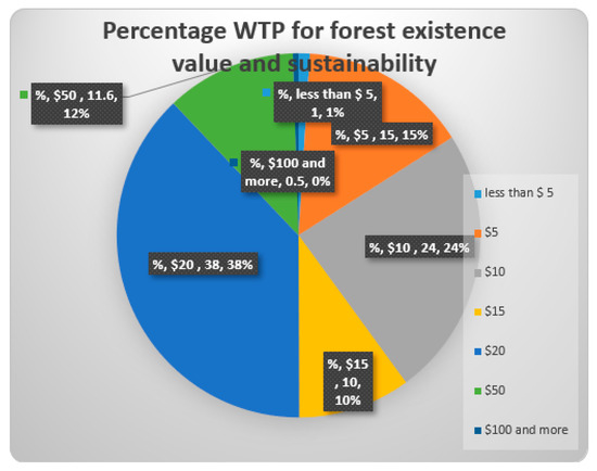 27] where willingness to pay values ranged from 1 to 200 USD for minimum and maximum, respectively. We chose seven categories in order to broaden the spectrum of choices for the respondents. This would allow the study to obtain the lowest bid for WTP for forest existence value and sustainability, as well as the highest bid [