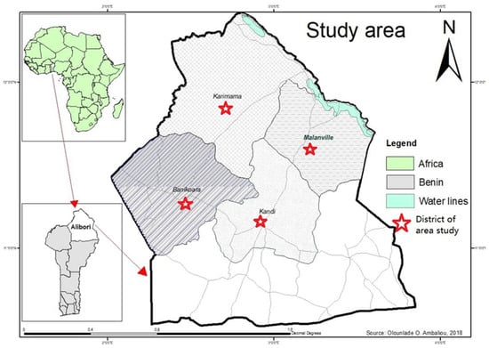 The year 1999 saw the creation of the Department of Alibori. This administrative division was formerly a part of the Borgou Department. The capital of the departments has been Kandi, since 2008. There are six subdivisions in the Alibori Department, each is positioned around one of the principal towns: Banikoara, Malanville, Gougounou, Kandi, Karimama, and Ségbana. We focused on farmers’ participation in contract farming as a management strategy to manage the challenges of rice production in four rice-producing districts (Banikoara, Kandi, Karimama and Malanville) in Alibori. These districts were randomly selected on the basis of their offers in all-out rice production in the department. The statistical data from these districts on their socioeconomic characteristics and exposure to different forms of production difficulties despite the existence of contract farming in the department were also taken into account in the selection. The location of the selected study area is depicted in Figure 1.