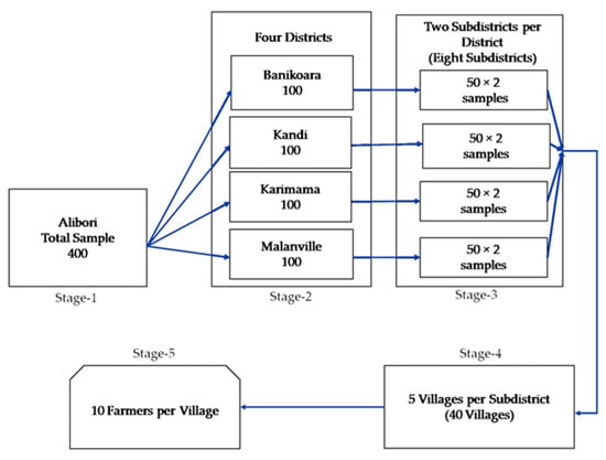 On the way to achieve the research objective, we used a multistage random selection method to choose the investigation territory and homestead family units. In the initial phase, Alibori Department was chosen as the fundamental examination zone dependent on its higher commitment toward all out agricultural gross domestic products in Benin. In the subsequent advance, we randomly chose four districts where rice is produced. In the third and fourth steps, from each selected district, two subdistricts and five villages per subdistrict were chosen using random selection methods. During the last phase, ranch family units were chosen from every village from the list of farmers provided by the Territorial Agency for Agricultural Development. Figure 2 outlines the sampling framework.