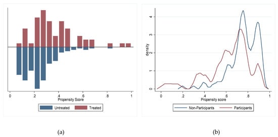 Propensity score distribution and common support for propensity score estimation. (a) The propensity score distribution; (b) the common support for the propensity score estimation.