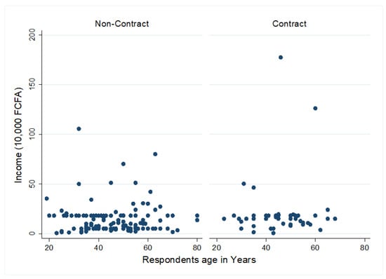 By classifying the farmers surveyed according to the classification of young and adult populations of the United Nations [50], we confirmed with Figure 4 our results in Table 9 that age has a negative influence on agricultural income due to the decline in income observed among respondents aged 50 years and over; the trend is positive until the age of 50 years and that, whether with contracting farmers than noncontractor. This results is consistent with that of Aminou [41], which finds that older producers would be more conservative so that they want to continue with their habits, customs of production.