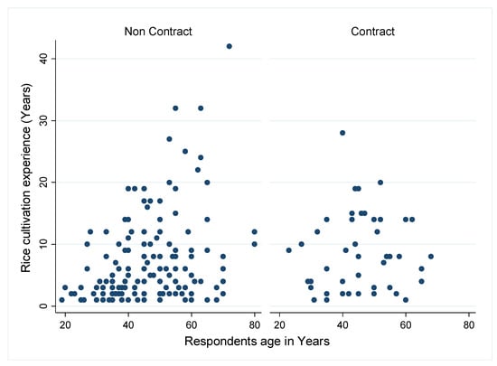 In this study, the instrumental variable (z) used was the contract farming knowledge. Then, for any rice farmer who knows the contract farming system, , and otherwise. We chose this variable because information has an impact on the decision as to whether to participate in contract farming. Therefore, farmers with knowledge on the contract farming system only are able to participate in contract farming. Knowledge cannot, however, only directly affect the outcome. Then, rice-producing is a valid instrument and fulfills Heckman’s [33] interpretation of the instrumental variable.