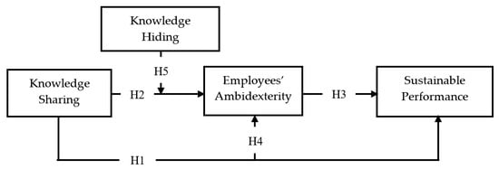Employees’ ambidexterity provides a favorable environment for an organization’s individuals that dynamically adjusts through the process of exploration and exploitation, confirms the innate system, and enables the learning of new methods and improvements []. In contrast, sustainability performance has been marked as necessitating short-term actions to cover up compromising long-term actions that can be clustered into ‘‘triple bottom line’’ approaches, namely, financial, social, and environmental approaches []. Employees’ ambidexterity is an important pipeline for applying and achieving organizational sustainability goals [,]. Organizational structures should be adapted over time to accommodate employees’ exploitative and explorative desire to promote sustainability []. The influence of employees’ ambidexterity can be advanced through the process outlined by social exchange theory []. Through a mutual exchange process, ambidexterity reimburses and provides returns in the future, involving unspecified future obligations with a positive contribution []. The social exchange theory posits that knowledge sharing among the peers strengthens the merit of their ambidextrous activities, which in turn drives organizational sustainable performance. Therefore, based on the theoretical grounds and the previous literature review, this study proposes the following hypothesis: