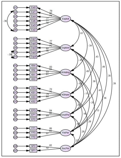 We applied AMOS 20 to check the reliability and validity issues by running confirmatory factor analysis (CFA). In a line where two or more constructs were developed using a similar method, this can lead to inflated or deflated corrections between latent constructs []. To resolve the issue of common method variance and multicollinearity issues, Harman’s single factor test [] and variance inflation factors (VIF) [] were calculated. Estimates showed that the first factor explained only 23.82% (<50%) [] of the result and the VIF score was reported to be below 5 []. Finally, we also investigated associations among all variables, using the method recommended by Pavlou, et al. []. It depicted that the highest correlation between any two variables was 0.620 (exploratory and exploitative ambidexterity), which was lower than the minimum threshold score (<0.90). Therefore, we observed no issues with method bias and multicollinearity issues.
