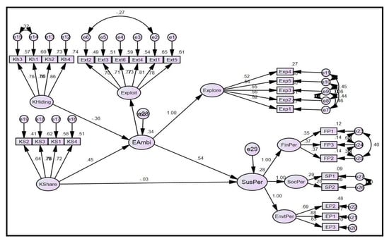 H4 tested the mediation effect between the variables, and the result showed that employees’ ambidexterity mediates the association between knowledge sharing and sustainable performance. The results underlined that employees’ ambidexterity fully mediated the relationship between knowledge sharing and sustainable performance. Every organization must try to facilitate individual ambidexterity through the activation of knowledge sharing to grow, sustain themselves, and be viable []. There is substantial evidence that knowledge sharing is a significant source of increased sustainable performance []. A study of Kim and Park [] showed that knowledge sharing stimulated the performance of sustainable organizations through the facilitation of stakeholders’ engagement. Drawing our conceptualization from self-determination theory, human capital theory, and social exchange theory, we can conclude that an intention to share can improve employees’ ambidexterity (self-determination theory) [,], which, as a consequence, (social exchange theory and human capital theory) gives rise to the enhancement of sustainable performance [,,,].