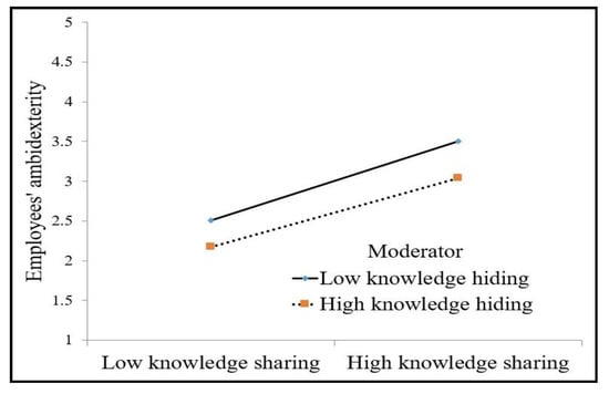 Similar to the investigation of the mediating effect, we also used process macros to examine the moderating effect []. Table 6 shows the moderating influence of knowledge hiding, which reveals that there is no significant moderating influence (β = −0.034, p = 0.599) of knowledge hiding over the hypothesized relationship. The insignificant influence of knowledge hiding on the hypothesized influence of knowledge sharing on employees’ ambidexterity asserts that more or less knowledge does not contribute to the fluctuation of the influence of knowledge sharing on employees’ ambidexterity. We plotted the statistical estimates in Figure 4. It unveils that knowledge hiding reduces, although not by a significant amount, the positive influence of knowledge sharing on employees’ ambidexterity. Therefore, H5 is also not supported.
