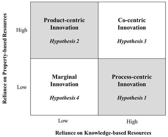 Secondly, the study also provides new insights to business executives and policy makers by showing why more attention should be paid to the inherent attributes of corporate resources in determining innovation strategies. The findings supported the critical role of corporate strategic resources in optimizing product and process innovation. In particular, the ‘resource-based matrix’ proposed in this study provides a new algorithm for understanding the mechanism by which corporate strategic resources influence innovation strategy decisions. That is, the findings suggest that innovation strategy decisions should begin by identifying which enterprise resources are the primary source of competitive advantage [14,15,49,51]. Accordingly, it might be first asked where the firm’s competitive edge is derived from PBR, KBR, or both types of resources. The company can then use the intrinsic nature of its strategic resources as a profound guide for identifying the most optimal innovation alternatives: (a) product-centric, (b) process-centric, (c) co-centric, and (d) marginal innovations. This resource-based innovation approach is thereby expected to enhance the company’s core competencies and ultimately lead to a sustainable competitive advantage [15].