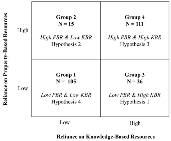 Finally, the study also contributes to the research methodology by newly developing scale items for KBR and PBR measurements. Existing studies have used self-selected indicators as proxy to measure KBR and PBR, so they often suffer from non-representative samples, and there is a limit to comprehensively estimating the characteristics of strategic resources of individual companies [59]. In this study, based on extensive literature review, we developed PBR scale items that can be used to measure the extent to which a company relies on property-based resources (e.g., patents, ownership, contracts, copyrights, trademarks, and registered designs) to maintain a competitive advantage [13,19,49,59,60]. KBR scale items were also developed to measure the extent to which a company relies on knowledge-based resources (e.g., a firm’s specialized skills, processes, technical and managerial systems, and know-how) to maintain a competitive advantage in the market [14,42,60,76,77]. These items were validated through various statistical methods, including Cronbach alpha, average variances extracted, and factor analysis, and were posted in the Appendix for future researchers.
