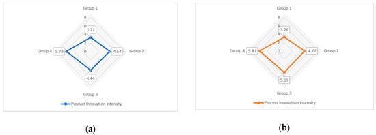 Group means: (a) product innovation intensity; (b) process innovation intensity.