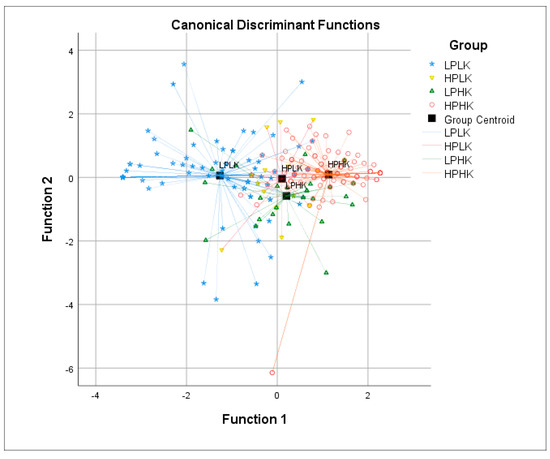 Territorial map for four group discriminant analysis (n = 257). Note: LPLK = low PBR and low KBR (Group 1); HPLK = high PBR and low KBR (Group 2); LPHK = low PBR and high KBR (Group 3); HPHK = high PBR and high KBR (Group 4).