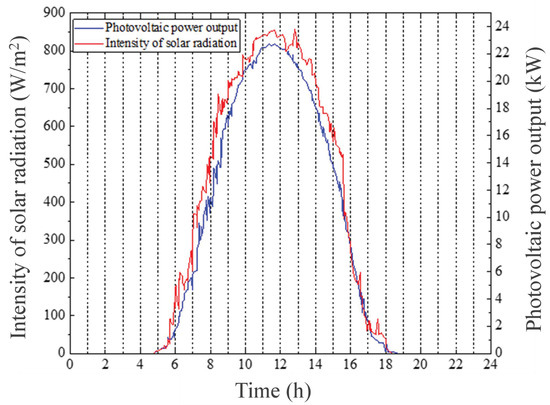 where is the solar intensity under new conditions of the standard test and . is the maximum output under the standard test. is the power temperature coefficient. represents the reference temperature, and . As shown in Figure 2, the output of the PV is simulated according to the historical solar intensity and the temperature data.