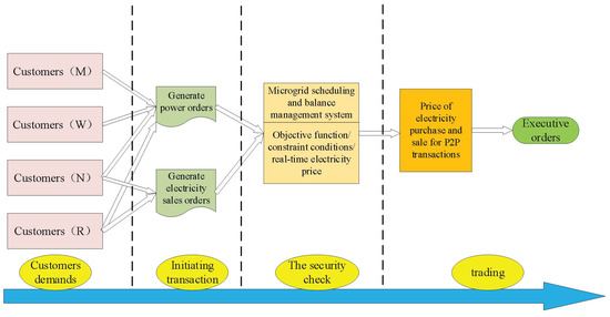 Figure 3 presents four major stages of the P2P energy trading process in the microgrid containing user demand, initiation of transactions, system verification, and execution of transactions. The transaction process can be implemented based on blockchain technology or other similar distributed networks. The blockchain record transaction information in the form of smart contracts spread to each node through a distributed network and form a consensus [24,25,26].