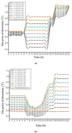 In this paper, the mixed integer linear programming (MILP) method based on YALMIP was used to solve the model. YALMIP is a solution toolbox written in MATLAB language. It can optimize the objective function by calling on a variety of commercial optimization solvers, such as LPSOLVE, CPLEX, and GRUOBI. In this article, we wrote the program code through the YALMIP toolbox and called CPLEX in the MATLAB operation environment to optimize the solution. Finally we got the optimal price of the 24 h P2P purchase and sale price in the microgrid, as shown in Figure 9a,b, and the minimum total operating net cost of the microgrid fluctuated with the value of parameter and , as shown in Figure 10.