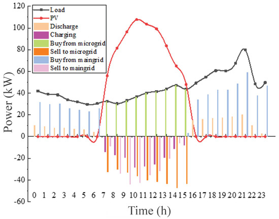 For microgrid users with PV only, the actual operation is similar to that of microgrid users with PV and BESSs. The power generated by PV production first meets its own needs, and then is sold to the P2P market to satisfy the demand of peers in the microgrid. If there is any surplus power, it will be sold to the main grid through the microgrid operator. The difference between the households with PV and battery is that they do not need to charge the battery. When the electricity produced by PV cannot meet their own needs, the only way to obtain electricity is to purchase electricity from the P2P market or the main grid, while the households with battery can meet their own needs by discharging the battery to reduce electricity expenditure.