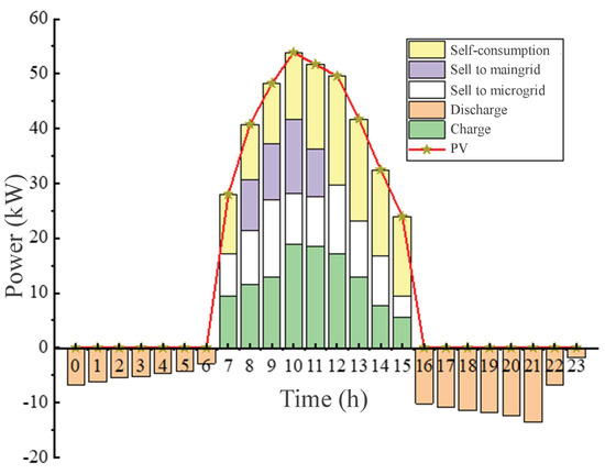 The operational performance of prosumers with PV generation and BESSs is illustrated in Figure 12. The PV outputs from 7:00 to 17:00 can be divided into four categories according to the method of energy usage: (1) Self-consumption for prosumers. (2) Charging the battery. (3) Trade in P2P market. (4) Export to the main grid. P2P energy trading for the distributed generation is a promising mechanism that enables the surplus energy of prosumers to be consumed in the local area, giving rise to the revenue of prosumers, helping with electricity cost reduction. As the Chinese government gradually reduces the subsidy for the new energy feed-in tariffs, the investment of social capital in the development and construction of new energy is also gradually reducing, which to some extent hinders the development of new energy industry. Therefore, a scientific and reasonable P2P trading mode is conducive to encouraging social capital to invest in new energy construction.
