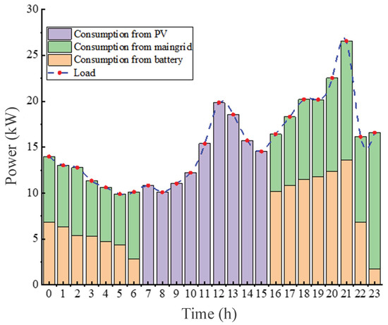 In Figure 13, the energy sources of households with PV and BESSs is depicted. From 0:00–6:00 and 16:00–23:00, PV stops functioning and households prefer to get electricity from battery discharge. If this is not enough, households will import electricity from the main grid under the help of microgrid operator. From 7:00–15:00, we can see that households like to treat PV as the first energy resource, as PV starts producing energy at this period. Owing to the friendly mode of electricity usage containing PV and BESSs, the PV output abandonment rate is considerably reduced.