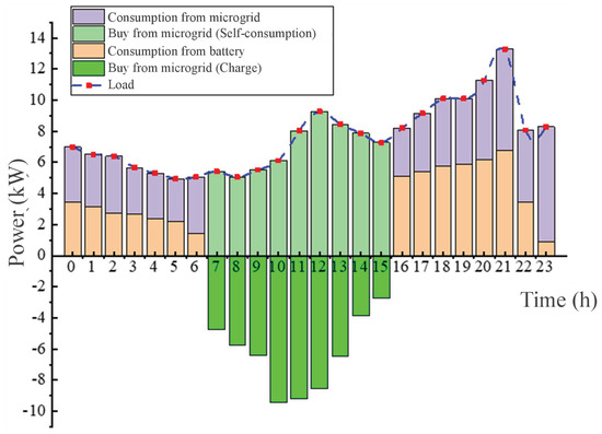 As shown in Figure 11, from 0:00 to 6:00, PV stops functioning and households can meet the demand by discharging the battery and importing electricity from the main grid. In the day, from 7:00 to 16:00, the PV starts to generate electricity, the outputs of which can satisfy the need for overall demand in the microgrid. To be exact, households with PV and BESSs will first meet their electricity demand, and then charge the battery to get revenue by selling surplus electricity to peers in the microgrid or exporting to the main grid. From 17:00 to 23:00, we can see that PV systems do not generate electricity and the energy resource for households comes from BESSs discharging or importing from the main grid. Figure 11 illustrates that energy transactions in the P2P market mainly occur from 7:00 to 16:00 of the day, of which the green part of the bar chart stands for energy purchased from the P2P market by households and the orange for energy sold in the P2P market by households. If PV outputs exceed the demand of prosumers, it will be more attractive for prosumers to first trade electricity in the P2P market, and then export surplus energy to the main grid cleared at retail price under the organization of the P2P operator, as the selling price of energy in the P2P market is relatively higher than that in the main grid and the purchasing price is quite the opposite. In general, the proposed P2P energy trading mechanism can achieve favorable savings for households with PV systems installed, decrease the electricity costs for users in the microgrid, and realize a win–win situation for prosumers and customers.