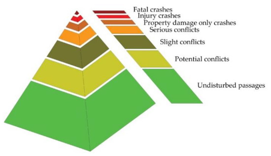 For these reasons, an alternative procedure was developed at the end of the 1960s. The concept is that of using traffic conflict data instead of crash data. Traffic conflicts are events in which crashes are more likely since drivers are driving close to each other. In 1987, Hydén [9] developed the concept of a “safety pyramid, or Hydén pyramid” (Figure 1) thanks to which it is possible to take into account all the possible interaction events that are inevitably created within any vehicular flow. According to this research, there is a connection between the severity of the event and the probability that it will occur. According to this approach, the most probable events are less serious ones, while less probable events are the most serious.