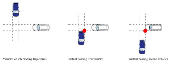 The PET time (Figure 3) was applied for the first time in the field of road safety assessment in 1978 by Allen et al. [11]. Considering vehicles on intersecting trajectories, the PET time is calculated from the moment in which the first vehicle passes at the intersection point until the moment when the second vehicle also passes.