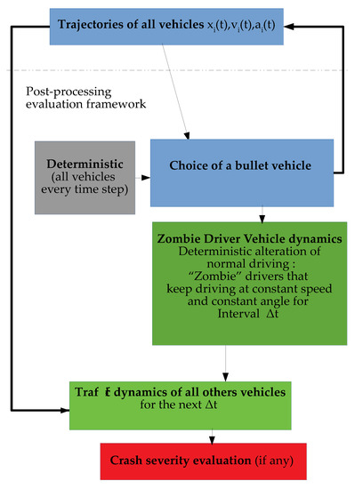 To address these problems and to boost the use of microsimulation for the assessment of traffic safety levels in 2018, in the Department of Civil Engineering of the University of Calabria, the Zombie Driver (ZD) methodology was developed [29]. The methodology follows the traditional approach of conflict based indicators and can be applied to real vehicular trajectories or simulated trajectories derived from microsimulation environments such as AIMSUN [13], VISSIM [14] and Tritone [28,41]. This methodology can encompass all the aspects described, and also introduces the human factor (the possible distraction of the users) as a trigger for accident events.
