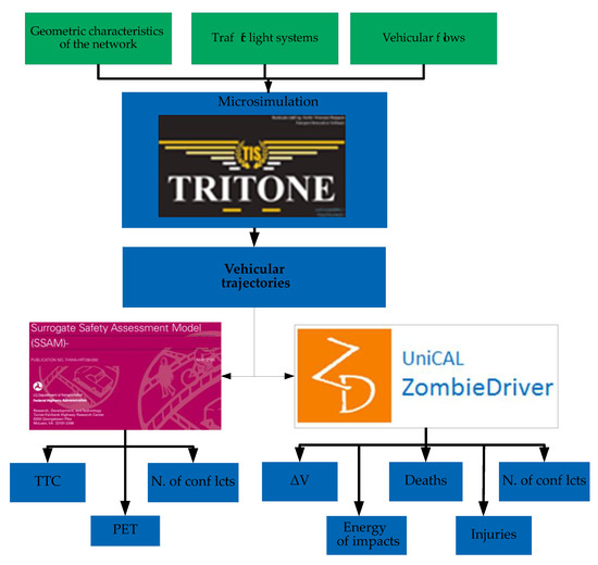To obtain trajectories, it is necessary to model the network being studied in the Tritone Software. The data needed for modelling are network geometry (arc length, lane width, lane number, gradients, intersection management features), the phases of the traffic signal systems, if present, and the type and distribution of the vehicular flows. Furthermore, in the same software the algorithm of the SSAM methodology [12] was completely implemented in order to obtain the following values of SSAM: