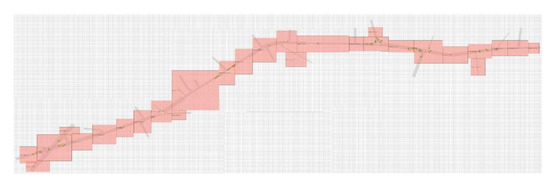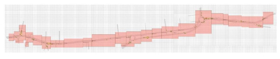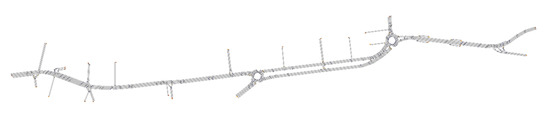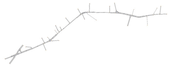 To make the real accident data comparable with the simulated data, a procedure for processing this data had to be developed. For this reason, it was decided to identify areas of influence starting from the intersections for both case studies. The remaining road sections were considered as road sections. The areas were plotted on the two networks using the Zombie Driver Software (Figure 10 and Figure 11) to facilitate the counting of simulated parameters falling within each area of influence.