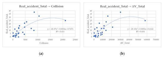 Case study 1, second degree polynomial regression: (a) Real accident total–Collision; (b) Real accident total–∆V Total.