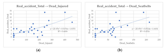 For case study 1, the serial pairs that were considered were Real accident total-Collision, and Real accident total-∆V Total (Figure 12). For case study 2, the serial pairs that were considered were, instead, Real accident total-Dead + Injured, and Real accident total-Dead Seatbelts (Figure 13).