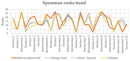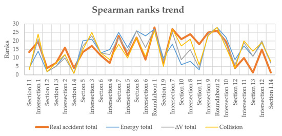 Below is the graphical comparison of the ranks between the series of accidents recorded on-site and the series of simulated parameters descending from the calculation of the Spearman correlation for the two case studies (Figure 14 and Figure 15). In the figures for each intersection or road section, it is indicated how it ranks in terms of real accident data and three different simulated parameters. This graphical comparison can help establish—at a glance—the capacity of the best three indicators for each case study to identify potential black spots. The parameters that are considered in Figure 14 relative to case study 1 are: Energy total, ∆V Total and Collision. The parameters that are considered in Figure 15 relative to case study 2 are: Energy total, Dead + Injured and Collision.