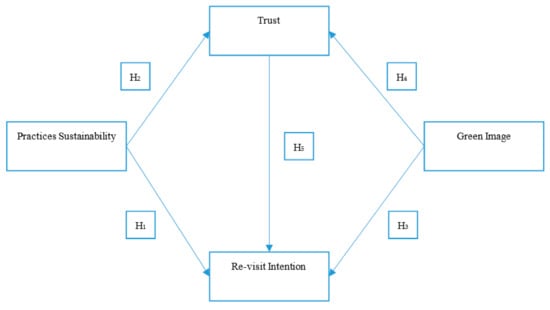 Therefore, this model shows the relationship between sustainability practices and re-visit intention, and between the green image and re-visit intention, through trust.