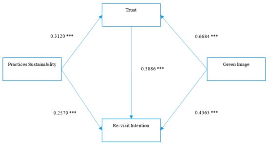 The conclusion of this study shows that there is a direct and positive relationship between sustainability practices and green image [,], on the behavior of tourists, in re-visit intention and also with higher weight in the direct relationship than in the indirect relationship through trust.