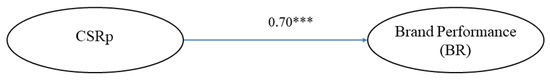 Structural model. Direct influence of CSRp on brand performance. Note: n = 282 χ2(13) = 31 CMIN/df = 2.38 ML, standardized results, RMSEA = 0.07, 90% CI [0.039, 0.102], CFI = 0.981, and TLI = 0.969. *** p < 0.001